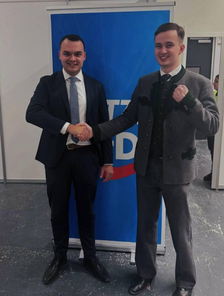 Tim Schulz: Mitglied der AfD Bayern, posiert auf Social Media u.a. in „Höcke Jugend“ T-Shirts am 27.09.2025 im österreichischen Steyregg bei einer Veranstaltung im „Castell Aurora“. Das Castell Aurora ist ein Hausprojekt der Identitären Bewegung. Die Immobilie wurde für 195.000€ im Jahr 2019 erworben worden. Kurz vor dem Kauf wurden auf das Konto 120.000€ durch den ehemaligen Berliner CDU Finanzsenator Peter Kurth überwiesen.